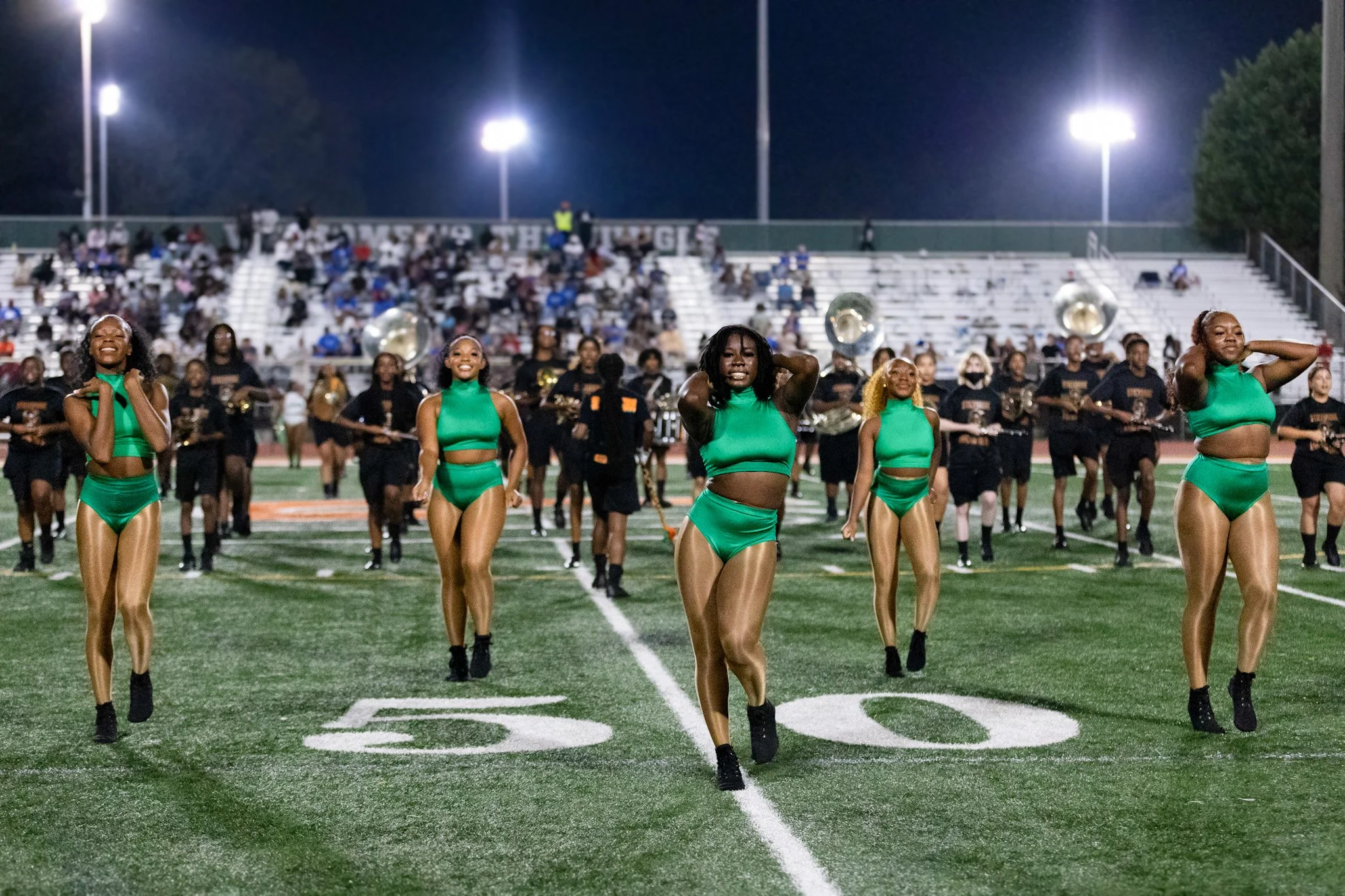Majorettes often perform in sync with the band, creating a visual representation of rhythm, style, and cultural pride.